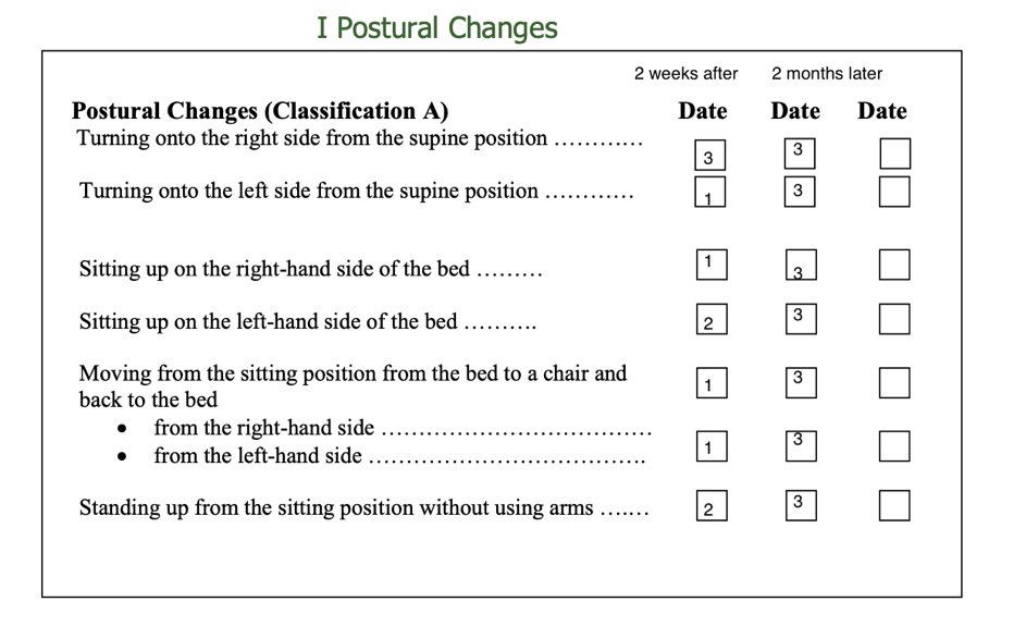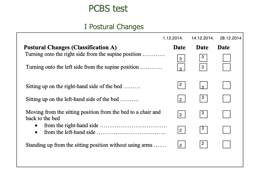 After two weeks Peter’s postural changes have improved and the performances are carried out safely in a controlled way without assistance (level 3). Watch the following video and measure Peter’s sitting and standing balance after 2 weeks post stroke by using the PCBS test. Give the points and write a short summary about his balance ability. Peter’s PCBS test 2 weeks after stroke.