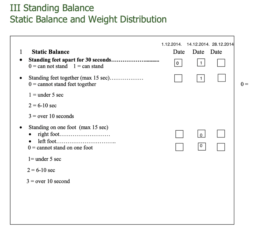 Regarding to standing balance and specifically to static balance, the patient has difficulties in controlling static balance (2 points). He is not able to standing on one foot without support and cannot handle standing feet together for 15 seconds.
