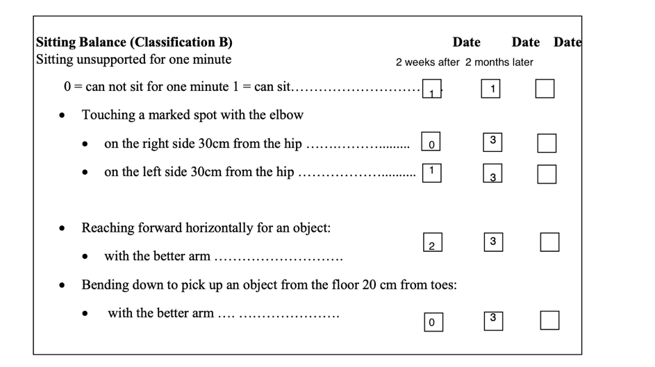 At 2 weeks, regarding to sitting balance, the patient has difficulties in controlling balance (4 points or classification 1). The client is not able to touching a mark spot on the right side nor bending down to pick up a beanbag 20 cm from the toes on the floor.