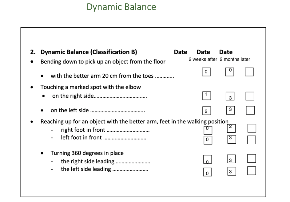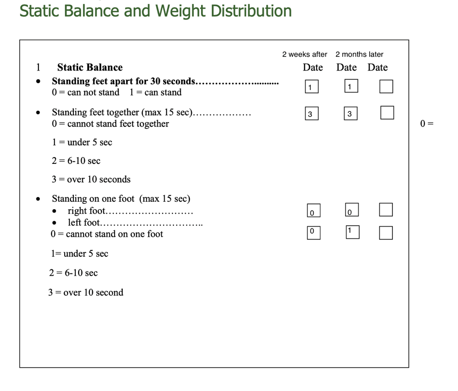 Regarding static balance, the patient has difficulties in controlling static balance (4 points or classification 1). The client is not able to standing up on one foot of both sides. 2 months later, she has a moderate control of balance because she was able to handle standing up for 2 seconds on the left foot.