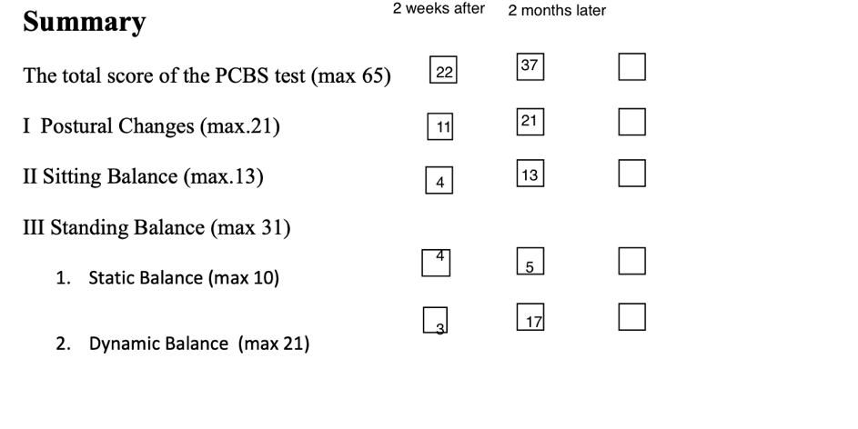 Watch the following video and measure the patient’s postural control by using the PCBS-test and evaluate how the patient’s postural control improved by using the PCBS – test scale and describe also by verbally by using the description bellow. Patient’s PCBS test performances 2 weeks and 2 months after stroke.